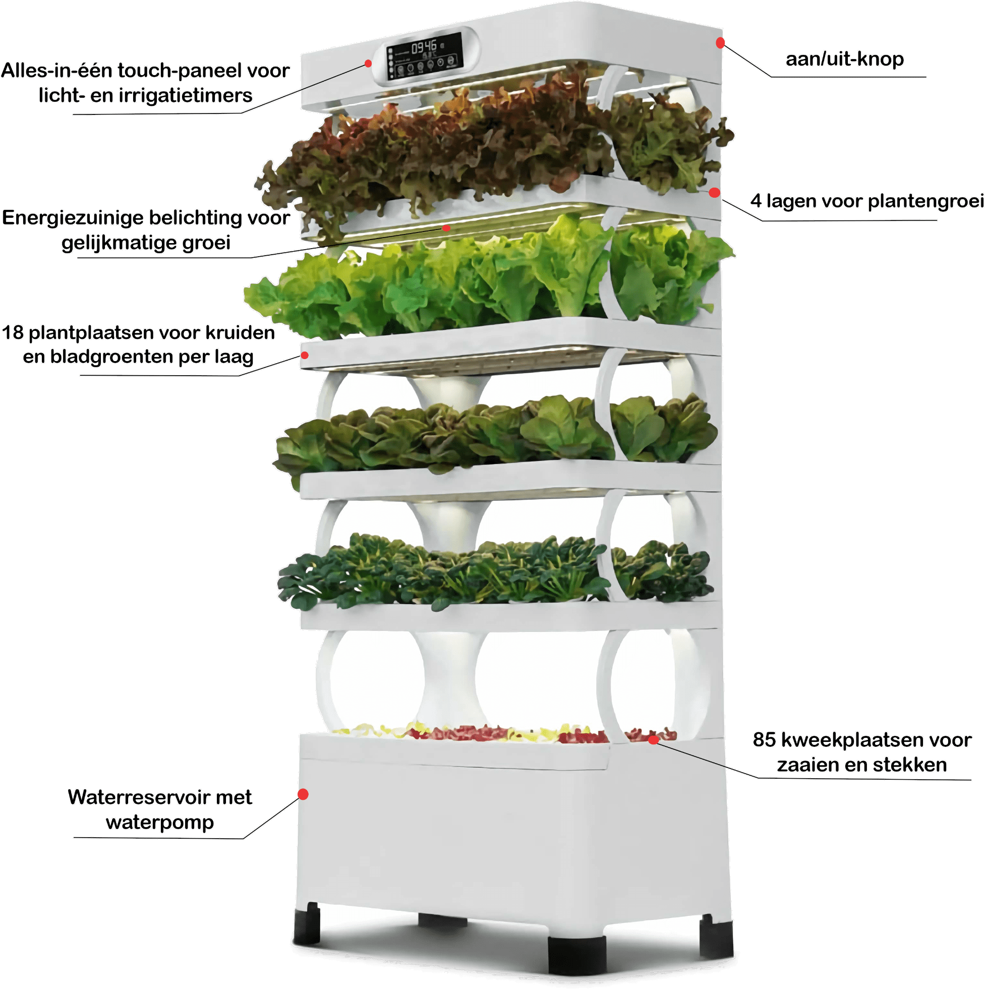 Onze hydrocultuurkast biedt vijf lagen met 157 plantposities. Met het digitale bedieningspaneel regelt u licht, water en voeding, terwijl de geïntegreerde pomp automatisch voor irrigatie zorgt. Kweek efficiënt groenten, kruiden of bloemen op minimale ruimte en profiteer nu van de tijdelijke lanceringskorting.