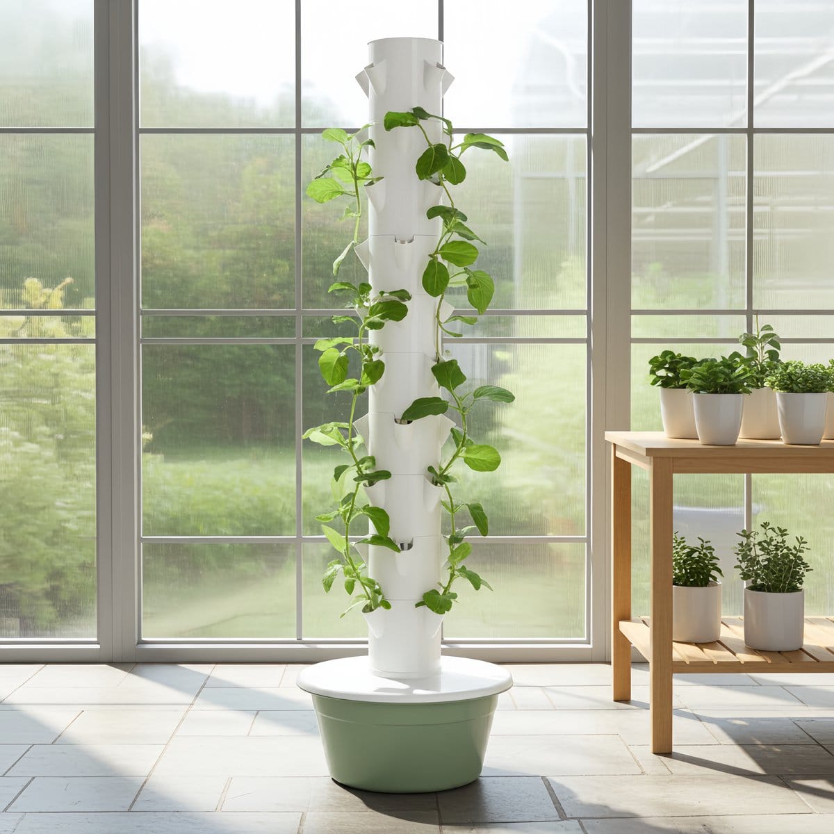De pomp circuleert water met voedingsstoffen door de toren, zodat de plantposities periodiek worden voorzien. Je kunt een cyclus instellen, bijvoorbeeld 3 minuten aan / 12 minuten uit.